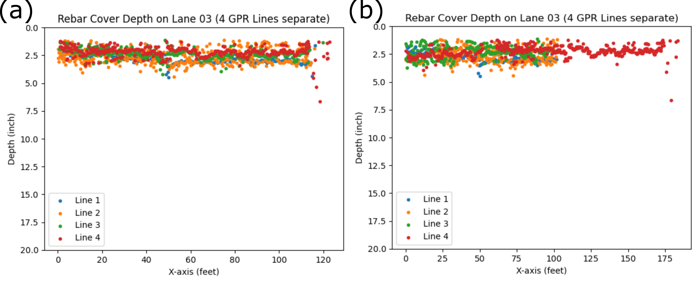 It is important to mention that we can measure the GPR survey line distance using scans-per-meter from the GPR configuration. However, this measured distance often does not align with the distances provided in the XML file. In Figure 8, we observe that all four GPR scan lines in a lane display very similar distances, with only a 1- or 2-feet difference among lines. However, upon splitting the consecutive GPR data into four lines based on the XML coordinates, we noticed significant discrepancies in lengths among these lines, totaling approximately 20 feet. This issue will result in significant spatial distortion on the rebar cover depth contour. To resolve this issue, we hypothesized that the measured GPR scan coordinate includes an offset value, resulting in an underestimation of the survey line distance for all four lines by a consistent amount. Our code addresses this issue by iterating through a range of offset values and adjusting the length of the four lines accordingly. We then select the offset value that equalizes the distances among the four lines. Figure 12 illustrates a comparison of the results with and without the offset correction.