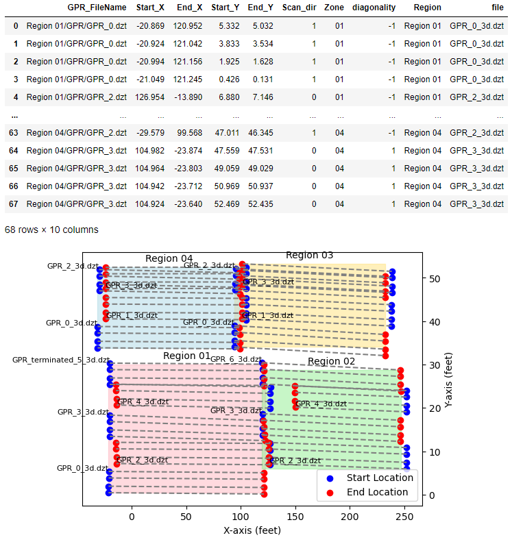 Figure 8 displays the outputs generated by the code, showing the data frame df_coord and GPR scan plot. The Mississippi I-10 bridge has a total of 68 GPR scans, with each line containing X and Y coordinates denoting the starting and ending points. In the data frame, the scan_dir column indicates the scan direction: a value of 1 signifies a forward scan (where Start_X is smaller than End_X), while a value of 0 indicates a backward scan. The diagonality column represents the slope of the GPR scan line, with a value of 1 indicating a positive slope (where Start_Y is smaller than End_Y), and -1 indicating a negative slope. These columns will be used as a variable to process the GPR data.